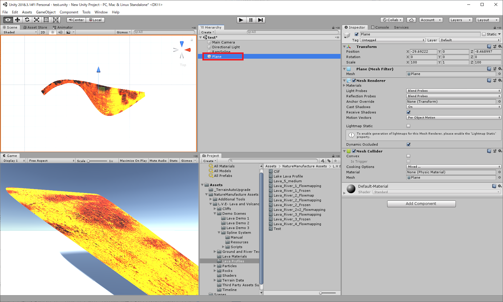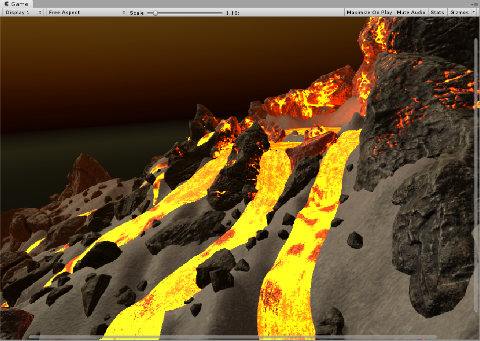 "Flow U Speed"と"Flow V Speed"で流れる方向と速さを調節できます。値をプラスにすると流れる速度を速く(赤っぽい色になる)。値をマイナスにすると流れを遅く(水色っぽい色になる)できます。適当に岩を設置します。岩のprefabは"Assets/NatureManufacture Assets/L.V.E- Lava and Volcano Environment/Rocks"の下に用意されています。 岩の手前は流れを遅くして左右に流れが変わるようにしてみました。