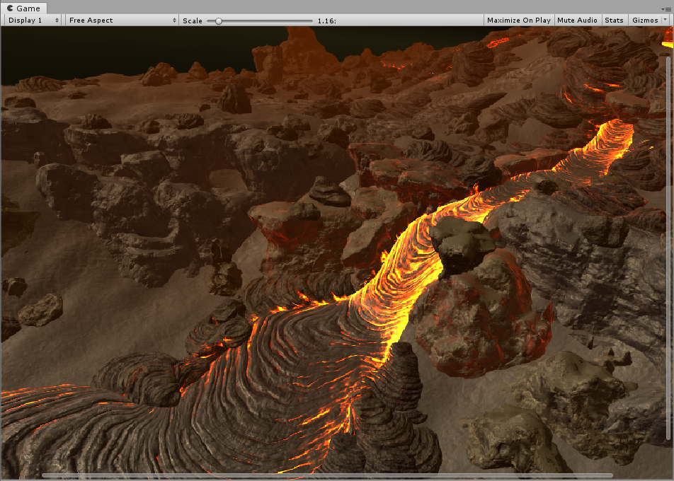 スプライン曲線で簡単に溶岩流を作成できます。溶岩流の幅や流れる速さ、流れる方向や溶岩の色を頂点毎に調整できたりと至れり尽くせりです。 また、今回は説明していませんが、コライダーを持った地形に対して溶岩流を自動的にフィットさせる事(「Simulate」)なども可能です。